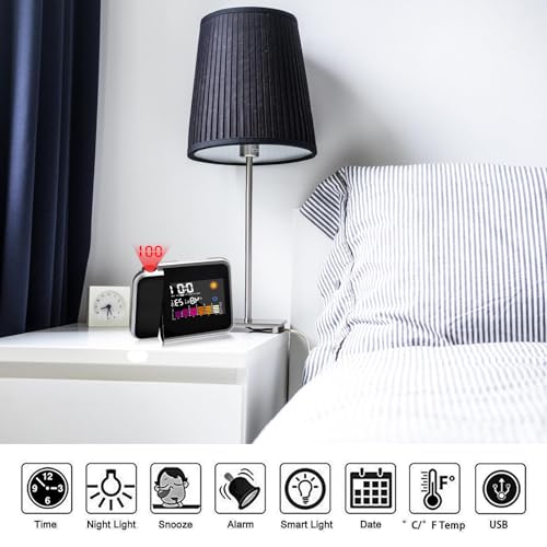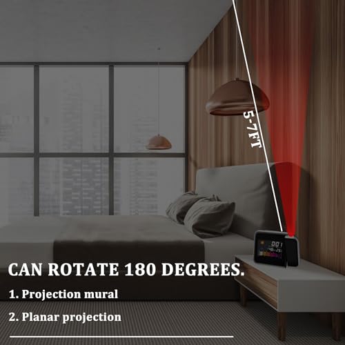 - Perfect gift: Compact and stylish clock with projection for bedroom, and digital alarm clock projection, perfect gift for your friends, family, lovers. The optimal projection distance is 2-5 metres. It measures room temperatures in the range of 0-50°C.