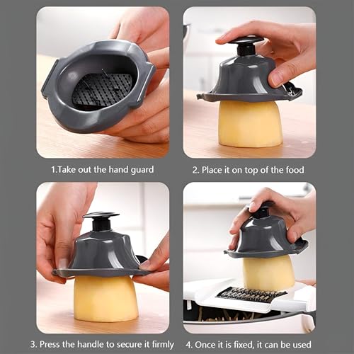 - KITCHEN TOOL - This set of cutting and cutting stencils has 7 interchangeable stainless steel knives, a food container, a bowl on the handle, a hand guard and a peel. The scraper with container makes it easy to cut your fruits and vegetables.