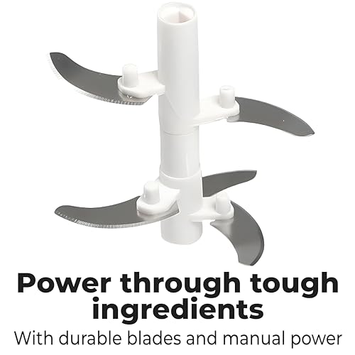 - Why does our manual chopper cut so fast All thanks to the three sharp blades. The three blades are arranged in different directions and heights to ensure that all ingredients are evenly chopped. The curved blade increases the contact area between the blade and the components, pull the cord once equal to at least 20 pieces with a conventional knife.