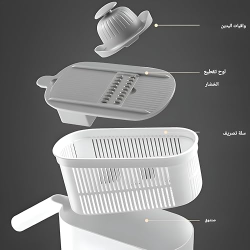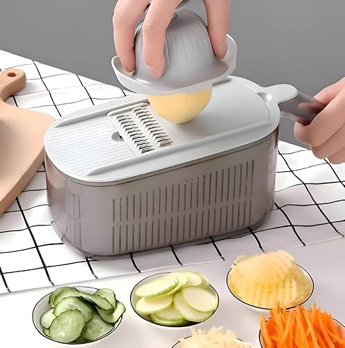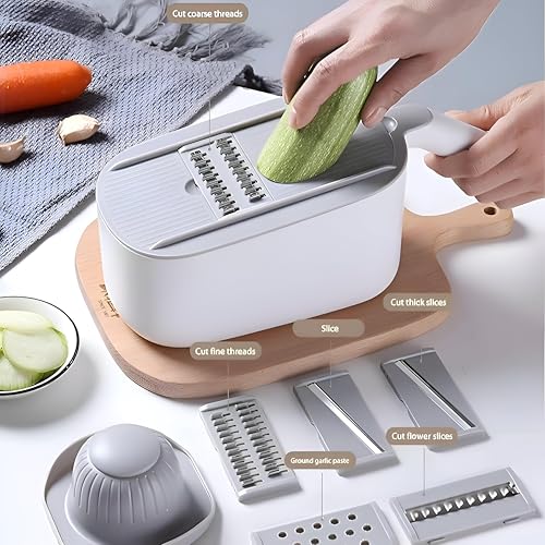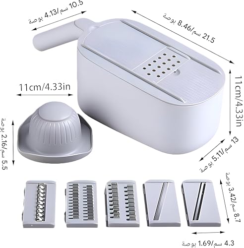 Generic - Veggie Slicer - This versatile vegetable slicer includes five interchangeable blades, an integrated chopping and grating module, plus a compact storage container for neat, white kitchen prep.