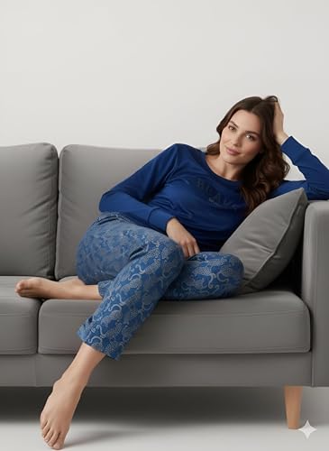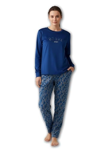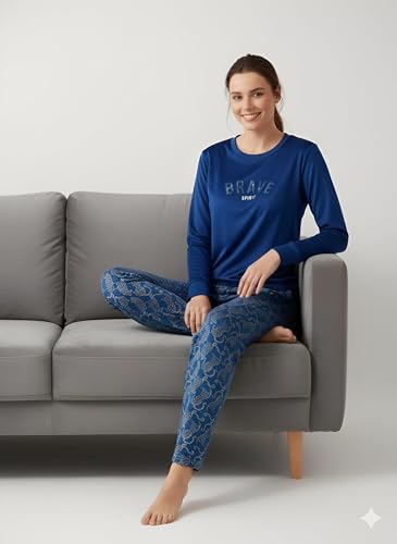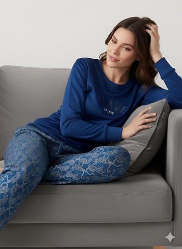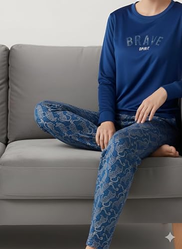 Generic - ملابس نوم قطيفة - بيجامة نوم بلون أزرق أنيق مصنوعة من القطيفة عالية الجودة، تيشرت بأكمام طويلة مزين طبعة «Brave Spirit» وبنطلون بنمط بيزلي، مثالية للأمسيات الرائعة، مقاس 80 - 110