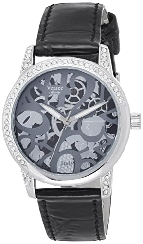 Venice - Venice V8086-IPS-B Crocodile Embossed Leather Stones Embellished Bezel Round Analog Watch for Women - Black