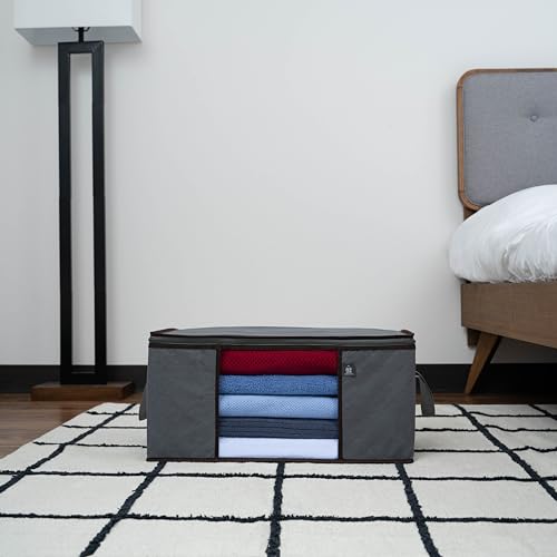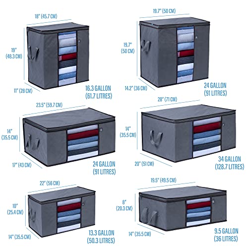- The Large Size – 55.9 W x 25.4 H x 35.6 D (cm). 13.3 Gallons or 50.3 Liters of storage capacity. Large capacity and spacious enough to fit various items such as clothes, towels, linens, sheets, pillows, shoes, etc. Multi-functional and ideal for storing seasonal clothing, transporting your bedding and blankets during moves, and freeing up extra closet and drawer space. Conveniently store in narrow closet or drawer space, on top of your closet rack, or under your bed!