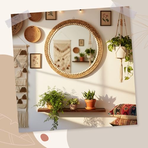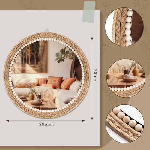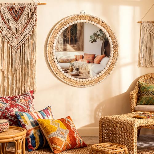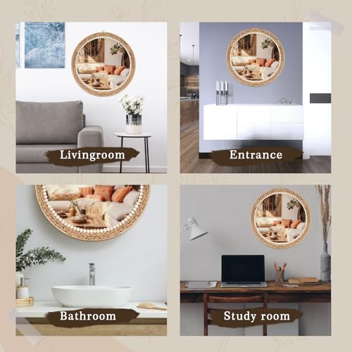 - Natural Rattan Handcrafted Round Mirror: crafted from natural rattan, wooden beads, and clear glass, this boho mirror features delicate woven textures and smooth rounded beads; The glass offers clear reflection without oxidation; With its refined workmanship and sturdy yet elegant structure, it combines natural texture with practical function seamlessly