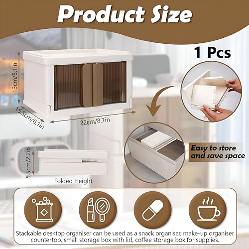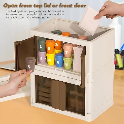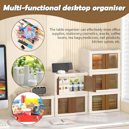 - The foldable desktop organizer comes with two doors, designed to efficiently store and access a variety of items. This versatile organizer can be used for office supplies, snacks, makeup, and even small storage cubes for coffee. Its functionality is tailored for optimal convenience and organization, ensuring items remain dust-free while being easily accessible.