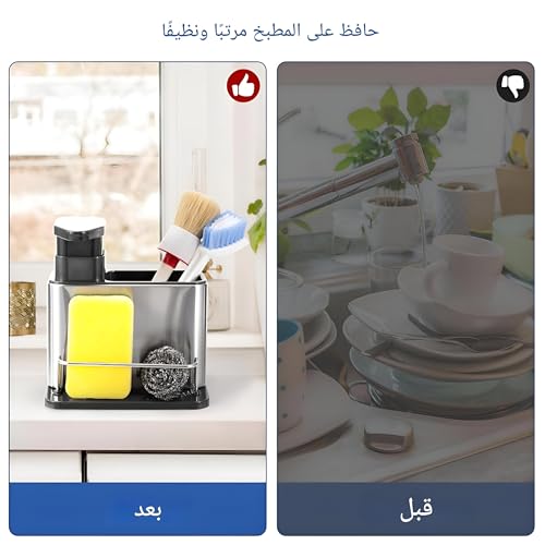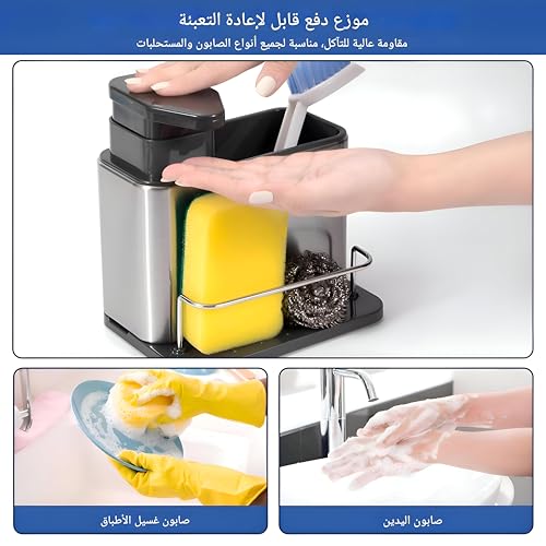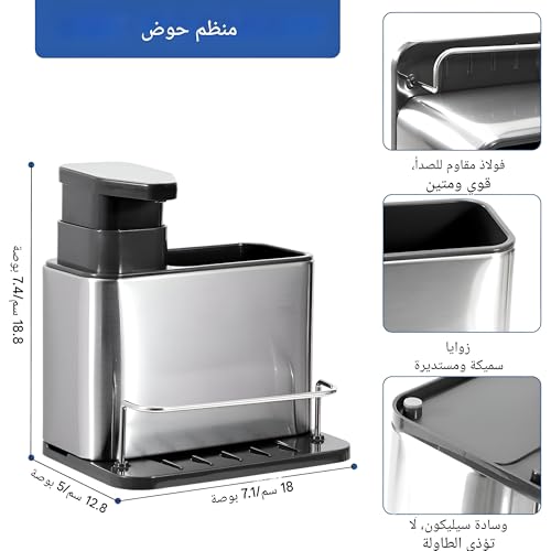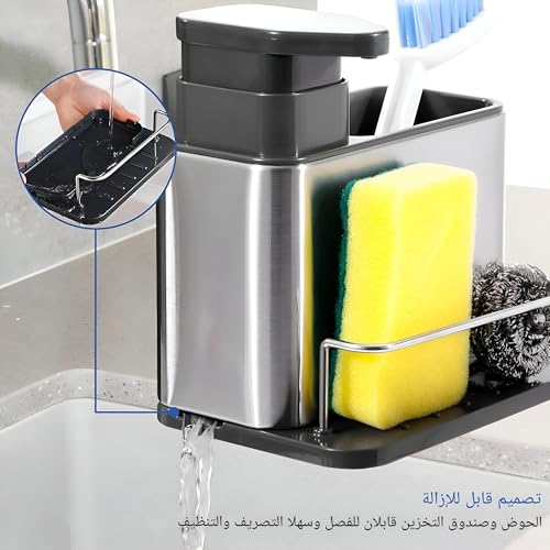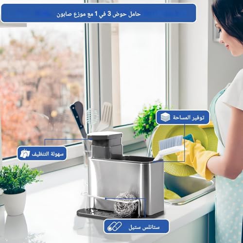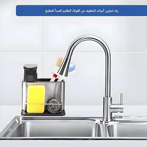 - This 3-in-1 soap dispenser and kitchen sink organizer combines a stainless steel soap pump with a storage compartment, making it perfect for both kitchen and bathroom use. It streamlines your cleaning essentials all in one sleek housing.