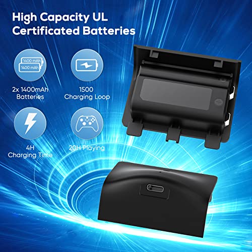 - 🎮【2x1400mAh Batteries】Our large capacity batteries for Xbox Series Controller,which features miniaturization, ultrathin and lightweight.More than anything,its excellent performance in safety and stability allows you to charge your controller with complete confidence,no need to wait more time and get more fun