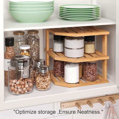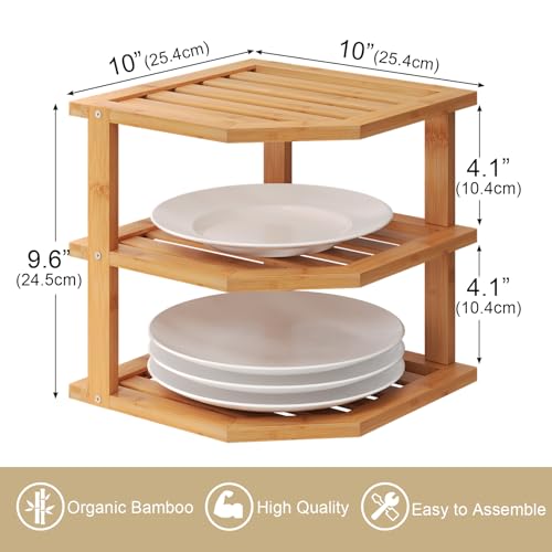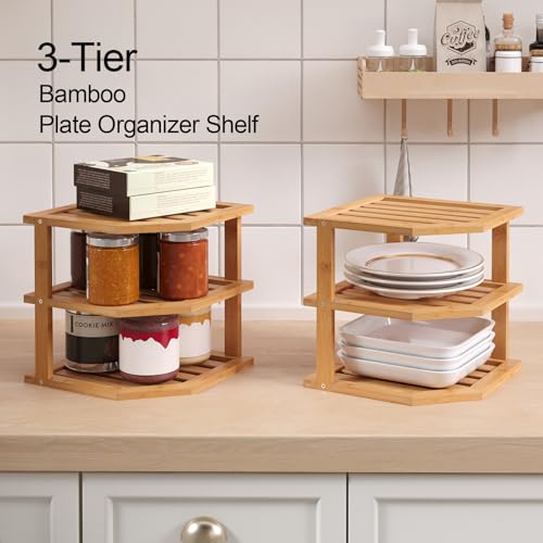 VERTORGAN - 3 Tier Bamboo Corner Shelf,Dish Drying Rack,Plate Organizer,Kitchen Spice Rack for Countertop and Cabinet
