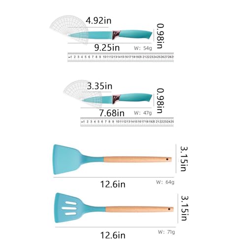 - [1 set of 19 pieces] 1 piece per piece: chef's knife, slicing knife, bread knife, multi-purpose knife, fruit knife, spatula, frying spatula, large spoon, small spoon, colander, spaghetti spoon, flat blade spatula, Scraper, oil brush, egg beater, food clips, plastic holder.