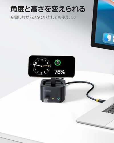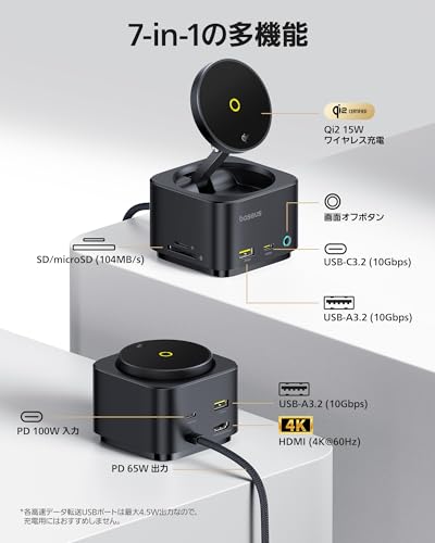 Baseus - موزع باسيوس ماج برو 2 USB نوع C 7 في 1 شاحن Qi2 بقدرة 15W 4K (60Hz) للشحن اللاسلكي ونقل بيانات سريع بسرعة 10Gbps × 3 منافذ توسيع قارئ بطاقات SD & تي اف بشحن ماجسيف مغناطيسي معتمد من كيو اي USB