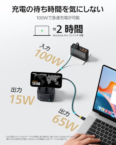 - (شاحن لاسلكي مغناطيسي كيو اي 2) معتمد من الجيل التالي للشحن اللاسلكي "كيو اي 2"، وهو أحدث معايير دبليو بي سي. يتم ربط الإغلاق المغناطيسي بهواتف ايفون 12 أو الأحدث ويسمح بالشحن السريع حتى 15 واط. لوحة الشحن صغيرة الحجم ولكن يمكن تعديلها بزاوية 70 درجة، ويمكن استخدامها أيضًا كحامل شحن. مع الشحن اللاسلكي كيو اي 2 وكيو اي، يمكنك أيضًا شحن حافظة سماعة الأذن. (*الحد الأقصى للإخراج هو 15 واط، اعتمادًا على الشاحن الذي تتصل به. (WPC: اتحاد الطاقة اللاسلكية، وهي منظمة صناعية تضع المعايير الدولية للشحن اللاسلكي.)