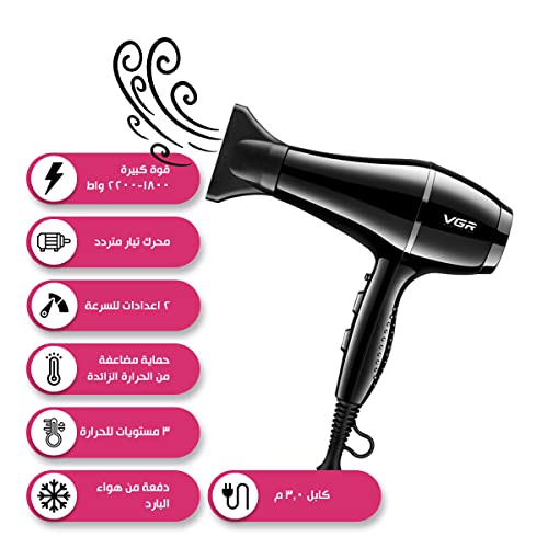 VGR - مجفف شعر في جي ار احترافي V-414 1800-2200 واط للعناية بالشعر، قوي وسريع الجفاف، 3 مستويات حرارة -2 للسرعة وزر تبريد، لشعر خالٍ من التلف، ضوضاء منخفضة، محرك تيار متردد مضاد للحروق متعدد الالوان، أحمر