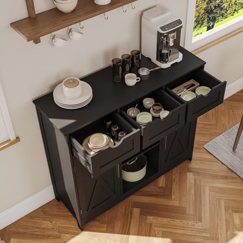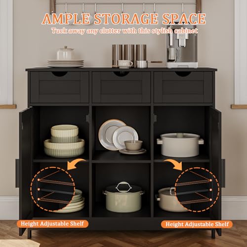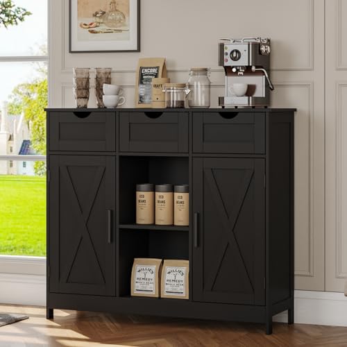 Viaozutis - Storage Cabinet, Coffee Bar Cabinet with 2 Adjustable Shelves, 3 Drawers, and 2 Doors, for Bathroom, Kitchen, Living Room (Black)