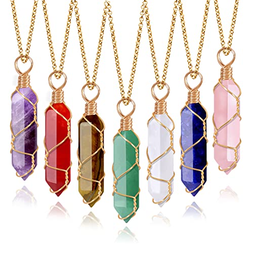 VIBILIA - VIBILIA 7Pcs Healing Crystal Necklaces Wire Wrapped Chakra Stone Point Pendant Necklaces Hexagonal Reiki Spiritual Quartz Gemstone Stone Jewelry Set for Women Men, Metal