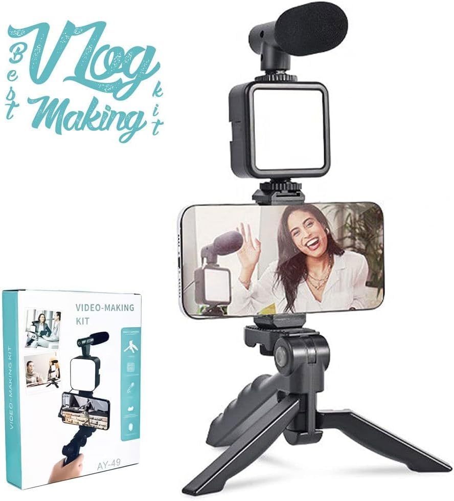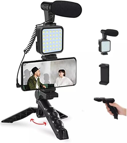 - ✅ All-in-One Video Kit: Includes a high-quality microphone, LED49R light, a stable tripod with a one-hand grip, and a phone holder for the perfect setup.