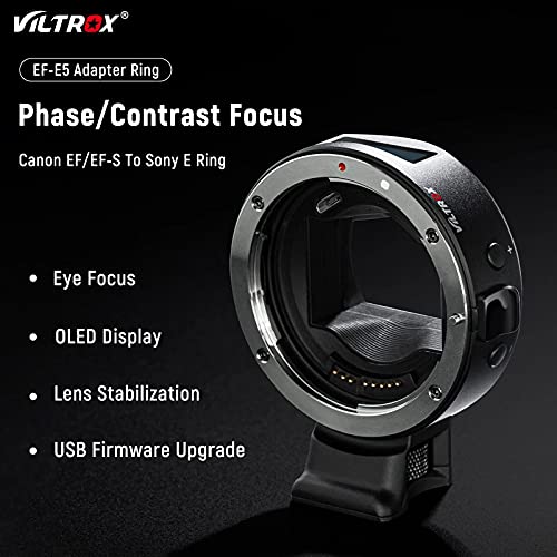 - 😊Viltrox EF-E5 lens adapter has been upgraded to the 5th Generation, more details been updated and make the adapter perform better. It allows EF /EF-S series lenses to be mounted on Sony NEX E Mount Camera and Camcorder. Weighing only 158g.