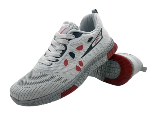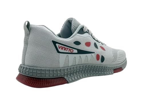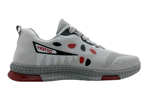 VInITTO - Athletic Running Shoes, White with Red Accents, Mesh Knit, Grey Rubber Sole, Breathable Sports Sneakers
