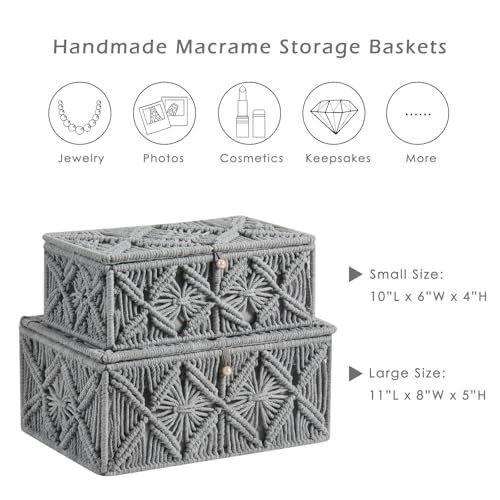 VinneGenzz - سلال تخزين بوهيمية مزخرفة مع غطاء، صندوق مجوهرات مكرمية بوهيمي منسوج يدويا من حبل قطني طبيعي، صناديق تنظيم مكياج وصور تذكارية من فينجينز، 2 قطعة (رمادي، 1 كبير، 1 صغير)