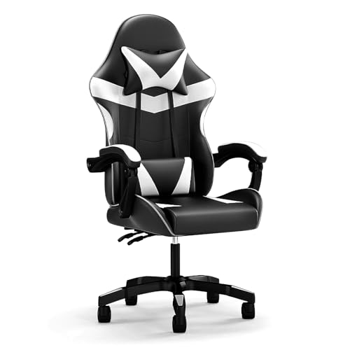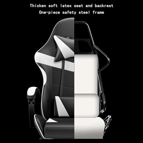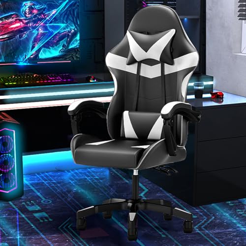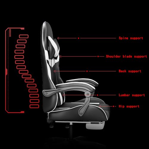 - 【Maximum Comfort and Relaxation】The gaming chair is equipped with a headrest and a massage lumbar pillow that will relieve you when your neck is sore from playing or working with your head down for long periods of time. When you feel tired from staying in the same sitting position, feel free to lean back the lumbar pillow, which will relax your tired lower back with energy.