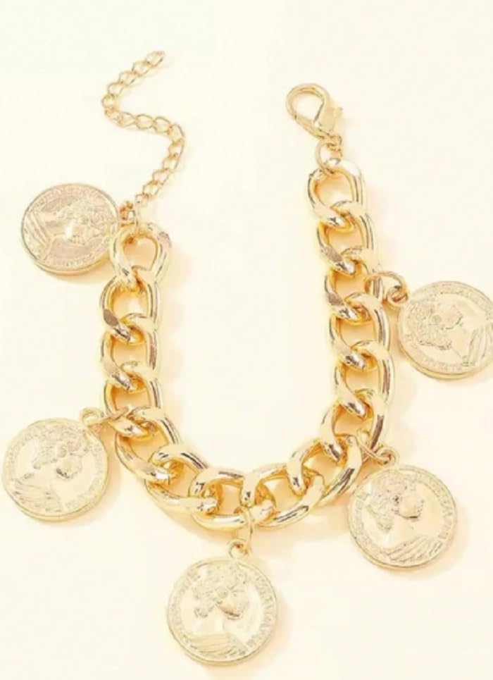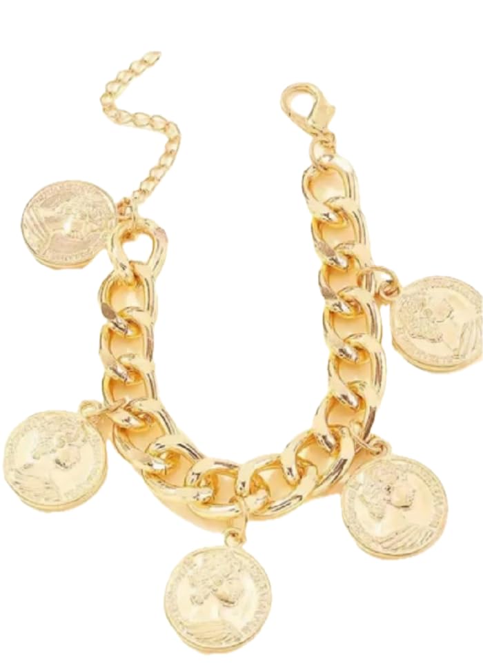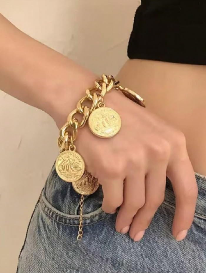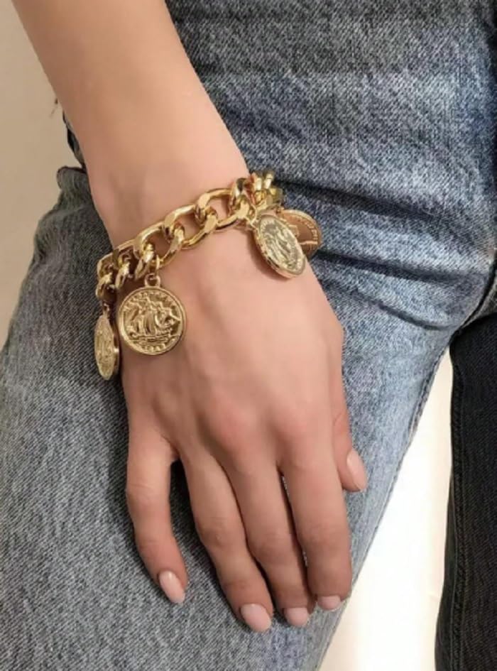 Generic - Vintage Coin Charm Bracelet, Women's Chunky Chain Style, Gold-Tone Metal, Geometric Design