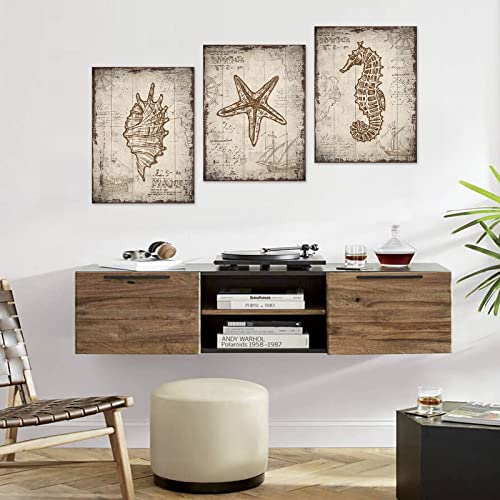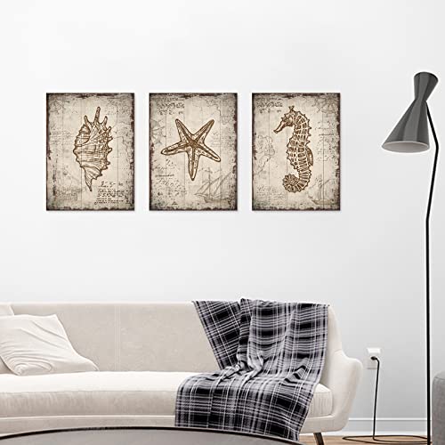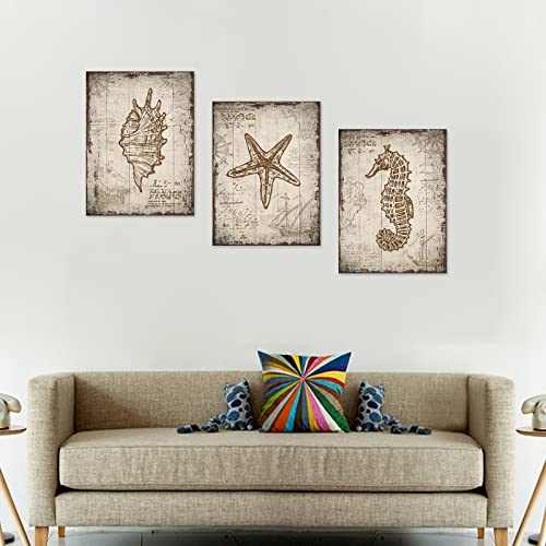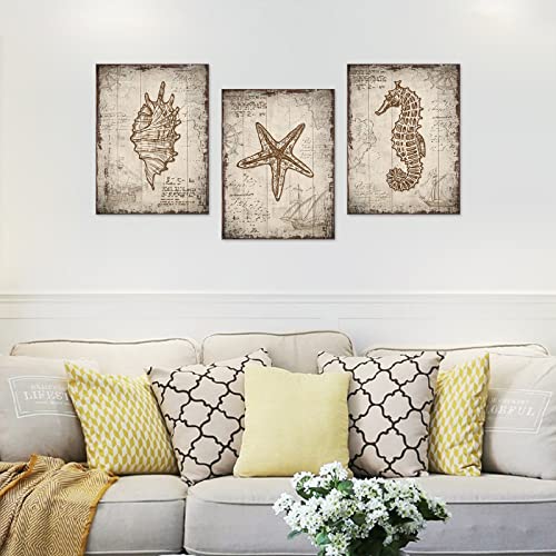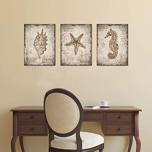 tigeridge - لوحة فنية جدارية من القماش بطبعة الشاطئ وصدف البحر والحياة البحرية بنمط ريفي مقاس 30 × 40 سم 3 قطع بلون بني