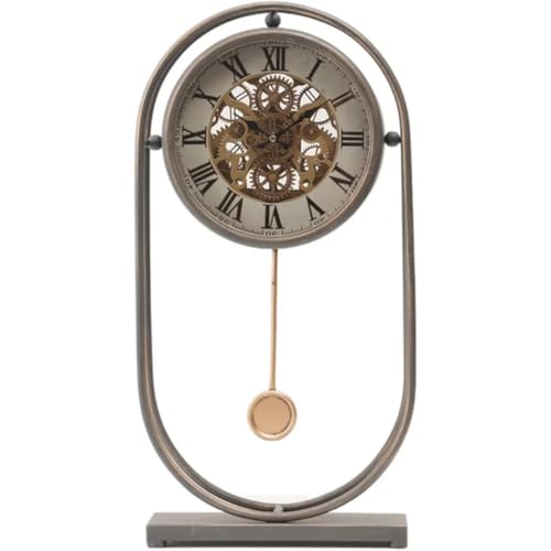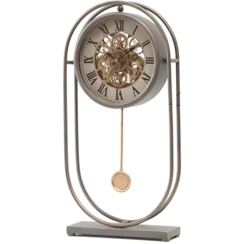 Generic - ساعة بندول معدنية عتيقة مزخرفة، لمسة نهائية برونزية، عرض ارقام رومانية مع الية تروس مكشوفة، تصميم قائم