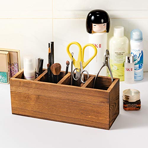 iKUGUI - حامل أدوات المطبخ العتيق الريفي مع 4 مساحات تخزين، حامل فرش المكياج، صينية فضية من الخشب المحروق، منظم تخزين أدوات المائدة على سطح الطاولة