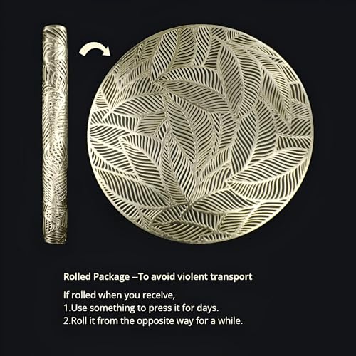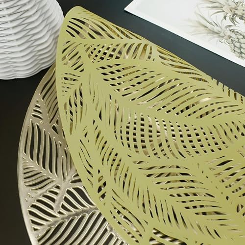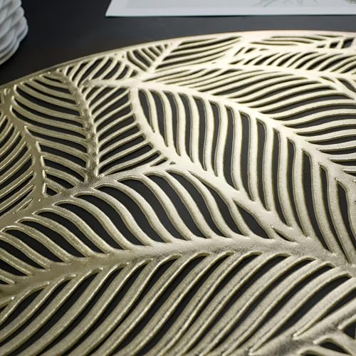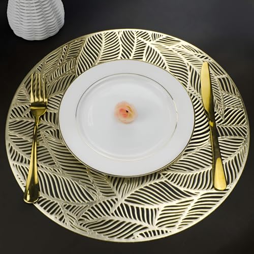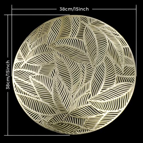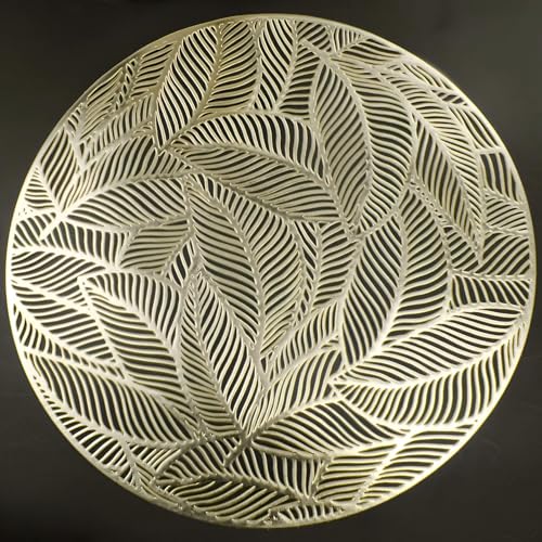 - Elegant round gold placemats with shiny leaf pattern add a luxurious touch to dining tables and wedding decorations.