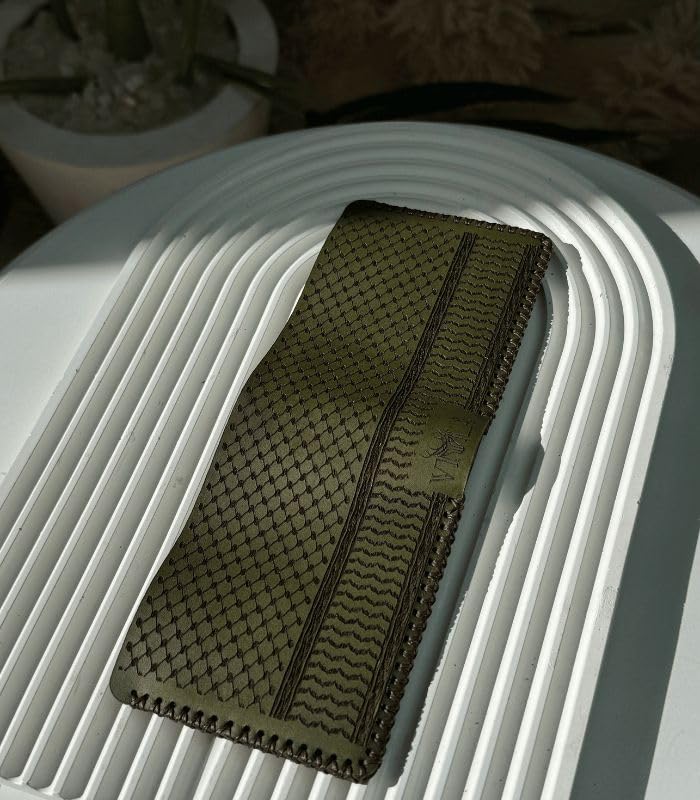 - مادة فاخرة: محفظة مصنوعة من الجلد الطبيعي عالي الجودة بتصميم منقوش تقليدي يعكس التراث الفلسطيني الأصيل