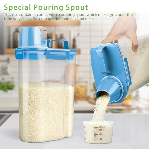 - RICE DISPENSER with POURING SPOUT: it adopts an ergonomic handle, comes with a measuring cup. The barrel body has a standard scale so you can pour things quickly and accurately every time. Slim and compact and space-saving