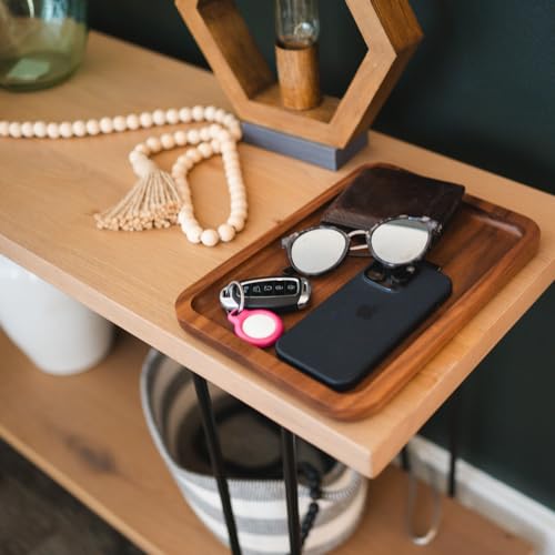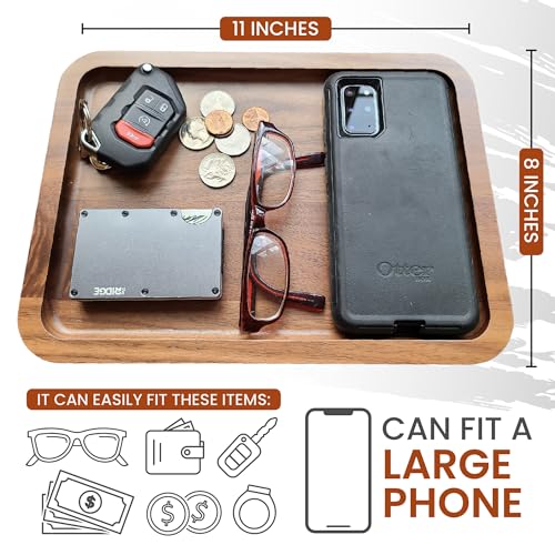 - The Details - sized at 11 inches x 8 inches, it fits most items in your pockets. If you love the look of a leather tray or a faux marble tray, you'll love the look of this rustic walnut wood organizer. The corners are smooth for a sleek look, and it matches most home decor.
