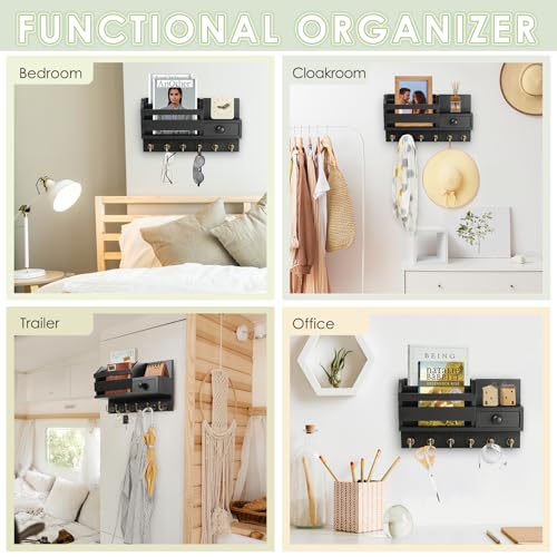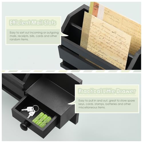- 💌 Small but Functional: Key mail organizer contains 6 key hooks, sturdy and well spaced, enough to hold a lot of keys and other necessities, 2 mail slots are perfect for sorting mails, envelopes, letters, papers, receipts, bills, little drawer with handy handle is easy to pull in and out, great to store random things, the shelf on top can put on calendars, knickknacks, small potted plants, nice addition and gives a safe place to keep essentials clutter-free.