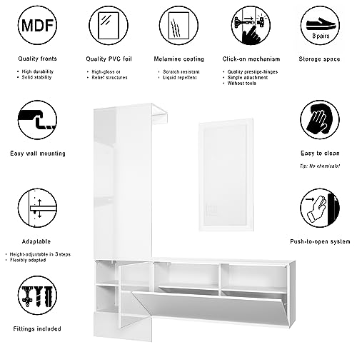- اضغط للفتح: بفضل نظام الدفع للفتح المجرب والمختبر، يمكنك بسهولة فتح باب ورف المعطف المثبت على الحائط. يتناسب التصميم بدون مقبض لدولاب الملابس بسهولة مع ديكور الردهة.