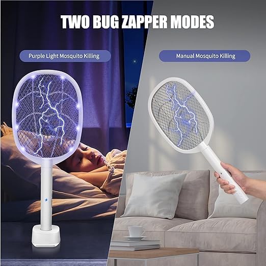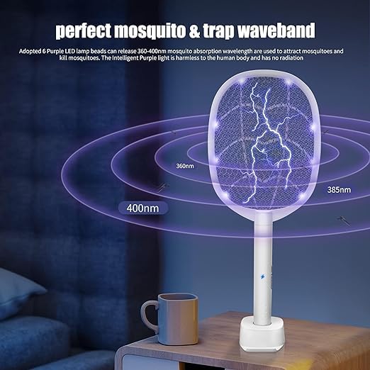 - 2 in 1 RECHARGABLE FLY RACKET: It is not only a bug Swatter Racket but also a mosquito Lamp, Extraordinary performance that gives you peace of mind.1)Manual mode: kill mosquitoes in seconds without using chemicals; 2)Smart mode: UV LED light beads that can release 360-400nm mosquito attracting wavelength, Mosquitoes will rush towards the electric shock net.