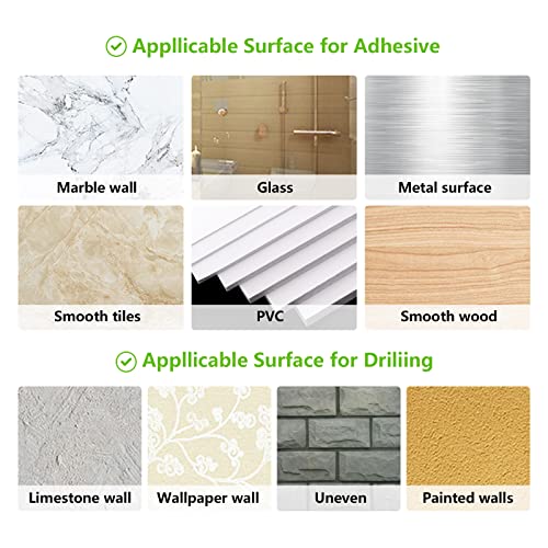 - ★【Easy to install】Super adhesive strong adhesion, no drilling, no damage to the wall (please make sure to stick to a smooth, hard and dry surface and use after 48 hours standing to avoid falling off). In addition, a screw installation package for drilling and installation is included to meet the different requirements.