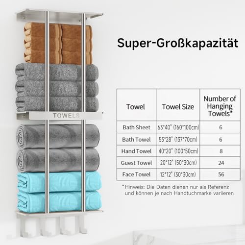 - Super large storage capacity: our towel rail wall: 86 x 32 x 14 cm, 14 cm distance from the wall. Super large enough to hold large rolled or folded towels. This towel rack can hold more than 6 large bath towels (size: 160 x 100 cm).