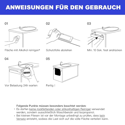 - سهلة التركيب: قضبان المناشف والخطافات ذاتية اللصق، لذلك يمكن تركيبها بسرعة دون ثقب أو براغي. تحتوي المجموعة على شريط 3 ام قوي لن يتلف الأسطح.