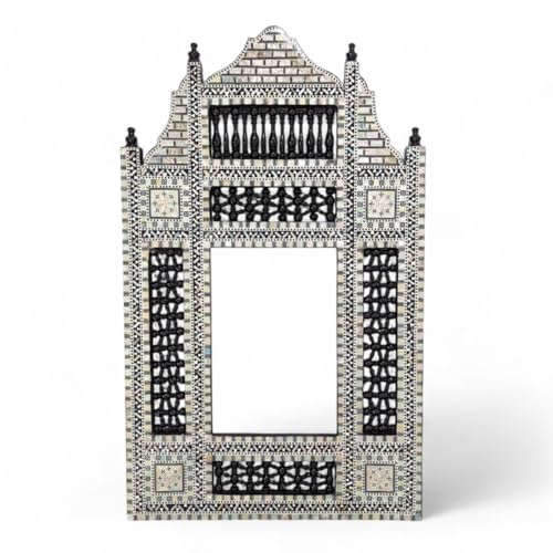 - DESIGN: Elegant Egyptian-style rectangular wall mirror featuring intricate arabesque patterns and decorative mother of pearl inlay work