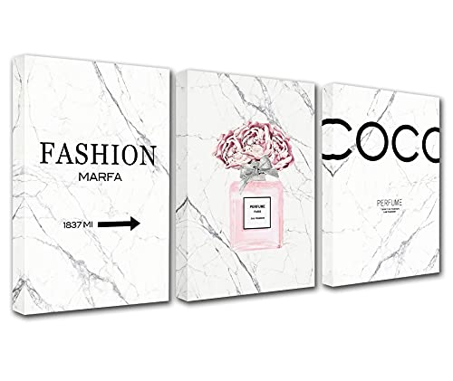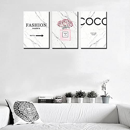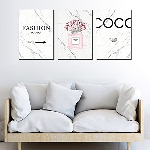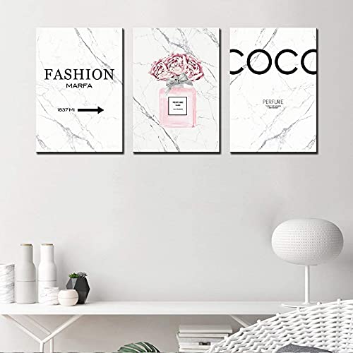 Walarky - Walarky Pink Perfume Fashion Women Canvas Wall Art for Living Room Decor Set of 3 Perfume Flowers Painting with Marble Background Home Decor Room Wall Pictures for Teen Girls Bedroom Framed 42x20 Inch