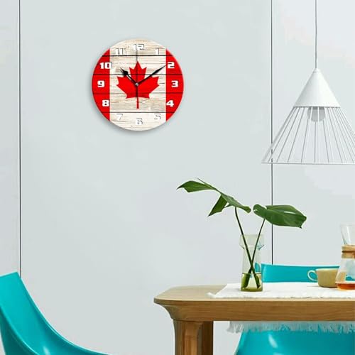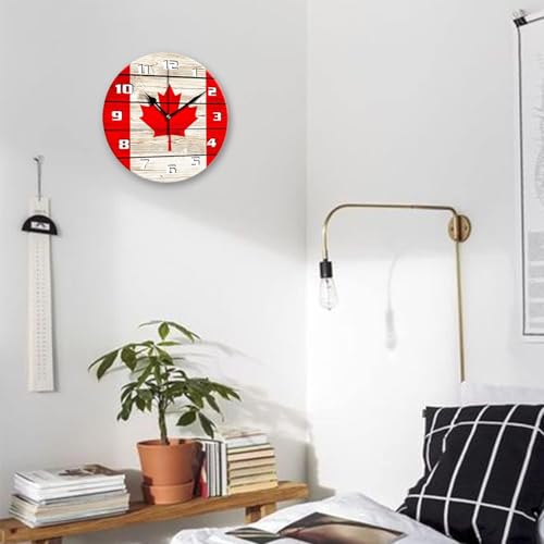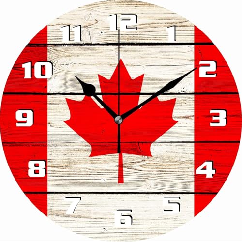 Generic - ساعة حائط كبيرة تعمل بالبطارية مقاس 12 انش، ساعة حائط كبيرة لديكور غرفة المعيشة، ساعة حائط دائرية بتصميم علم كندي خشبي