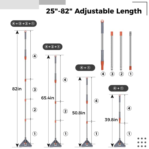 - 【مقبض طويل قابل للتعديل من 63 سم إلى 2.8 متر】بفضل المقبض المكون من 4 أعمدة، يمكن أن تكون المساحة موب قصيرة حتى 63 سم وطويلة حتى 2.8 متر. يمكنكِ ضبط طول المقبض عن طريق تغيير عدد أعمدة التمديد، ويوفر التصميم القابل للسحب للعمود الأول مساحة تعديل أكبر، مما يسمح لكِ بتنظيف كل زاوية دون استخدام سلم أو دون الانحناء، وهي أسهل وأكثر أمانًا