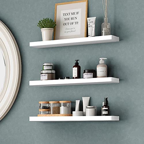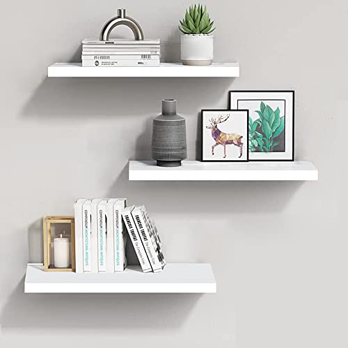 YARUKIMA - Wall Mounted Floating Shelves, White, Wooden Wall Decoration Shelf, Modern Storage Shelves for Wall, Home Display Shelves with Invisible Brackets for Bedroom, Bathroom, Living Room, Kitchen, Pack of 3
