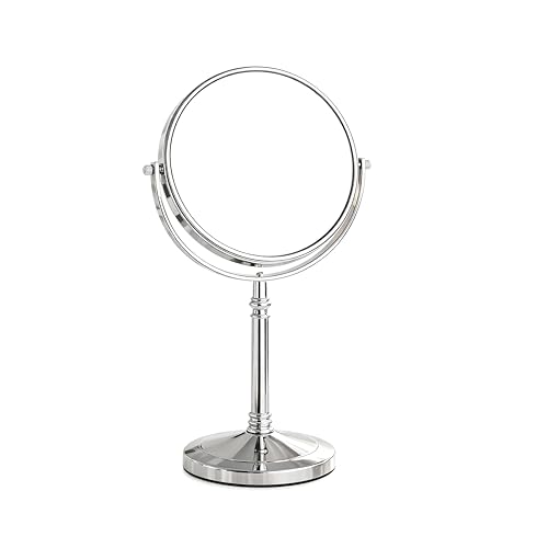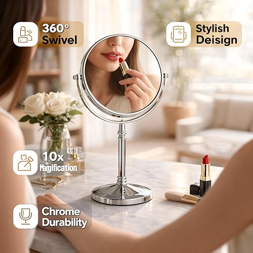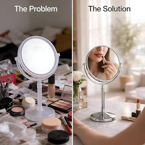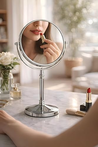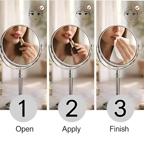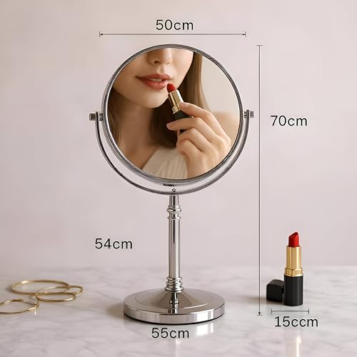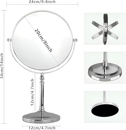 - The mirror rests on a sturdy pedestal base equipped with a smooth‑turn swivel mechanism and an angular sling arm, allowing you to adjust the viewing angle from a near‑vertical position to a comfortable tilt, ideal for precise makeup application, close‑up shaving, or detailed grooming tasks.