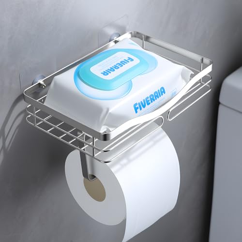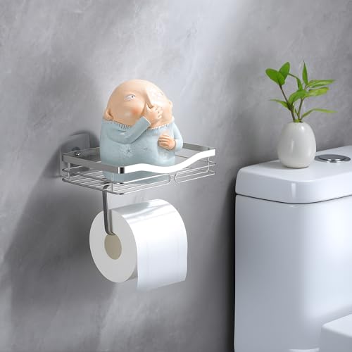 AIDILI - Wall Mounted Toilet Paper Holder with Shelf, Self Adhesive Toilet Paper Holder Adhesive Toilet Roll Holder No Drilling for Bathroom Stainless Steel Brushed