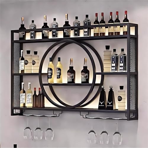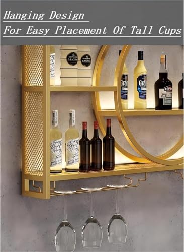 QFHUNCH - Wall Mounted Wine Rack with LED,3-Tier Metal Wine Bottle Shelf with Wine Glass Holder, Modern Bar Shelves Bar Liquor Bottle Display Shelf Multifunctional Wine Storage Rack for Home Bar (No Battery)