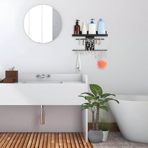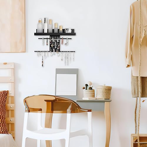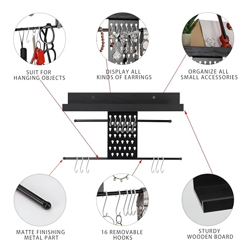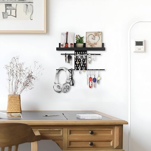 - This wall key holder combines a wide shelf for storing keys, messages, and small plants with a jewelry organizer with slots for displaying earrings, necklaces, bracelets, rings, and sunglasses, keeping the entrance tidy and keeping all necessary products at hand.