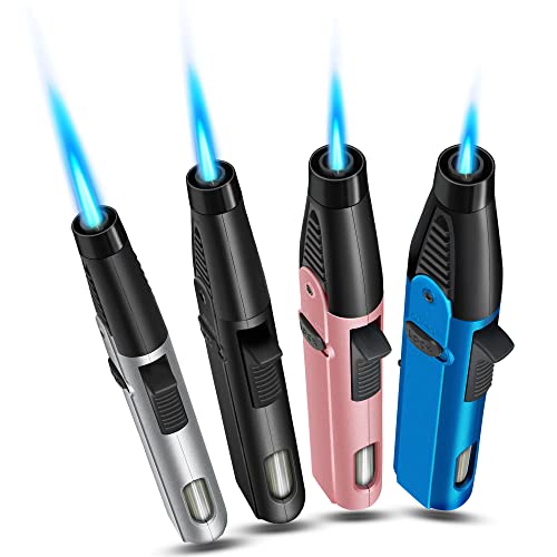 wanbro - 4 Pack of Torch Lighter, Windproof Jet Flame, Butane Gas Refillable, with Safety Lock & Visible Window, Long Blow Torch Lighters for Candle, Stove, Creme Brulee, Kitchen (Gas NOT Included)