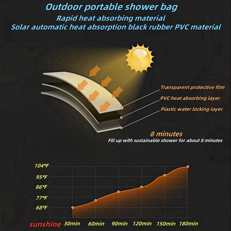 - سهل الاستخدام: يحتاج فقط إلى أشعة الشمس لامتصاص حرارة الشمس للحصول على الماء الساخن، مصمم بمفتاح تشغيل/إيقاف قابل للتعديل للتحكم في تدفق المياه. يمكن تعليق الحامل المزود بخطافات بسهولة على الشجرة أو خيمة الاستحمام لغسل جسمك أو وجهك أو يديك أو غسل الأطباق أو الطعام أو السيارات وما إلى ذلك.