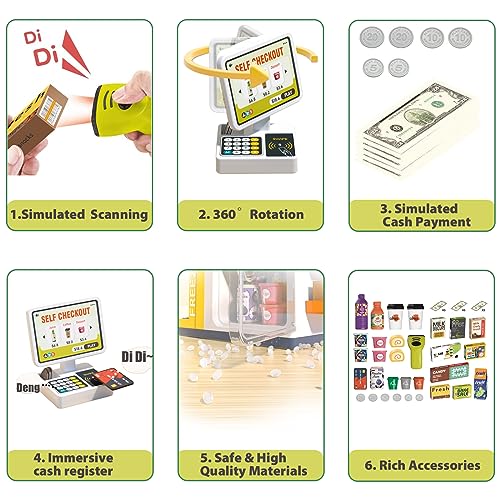 - لعبة آلة تسجيل النقود 2 في 1: لعبة بتصميم يحاكي التسوق الفعلي من حيث الشراء وأداء دور الكاشير، مما يمنح الأطفال تجربة بقالة واقعية. توفر ساعات لا تنتهي من المرح للأطفال، كما تعلم على تنمية القدرات العملية والمهارات الاجتماعية لديهم أثناء اللعب.