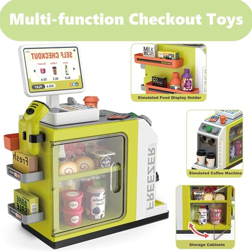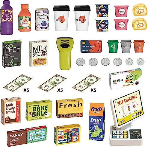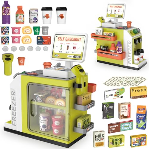 WASAiKA - آلة تسجيل نقود ولعبة متجر تفاعلية للأطفال مع سكانر وآلة حاسبة تضم ماكينة تحضير القهوة وبطاقة ائتمان ونقود وأطعمة للعب التخيلي مناسبة للأولاد والبنات من عمر 3 سنوات فما فوق من واسايكا